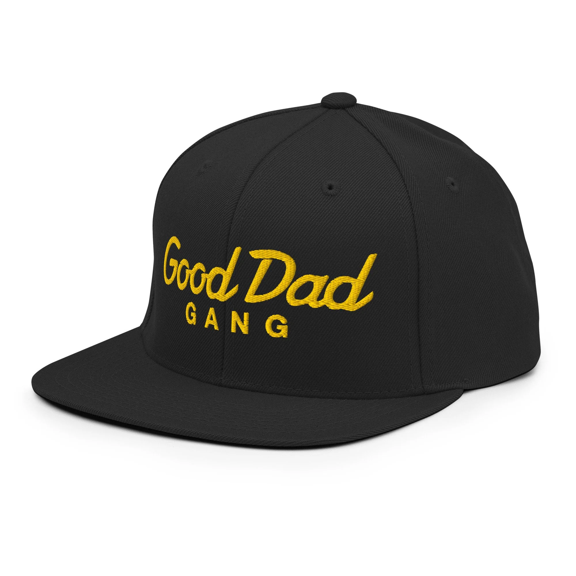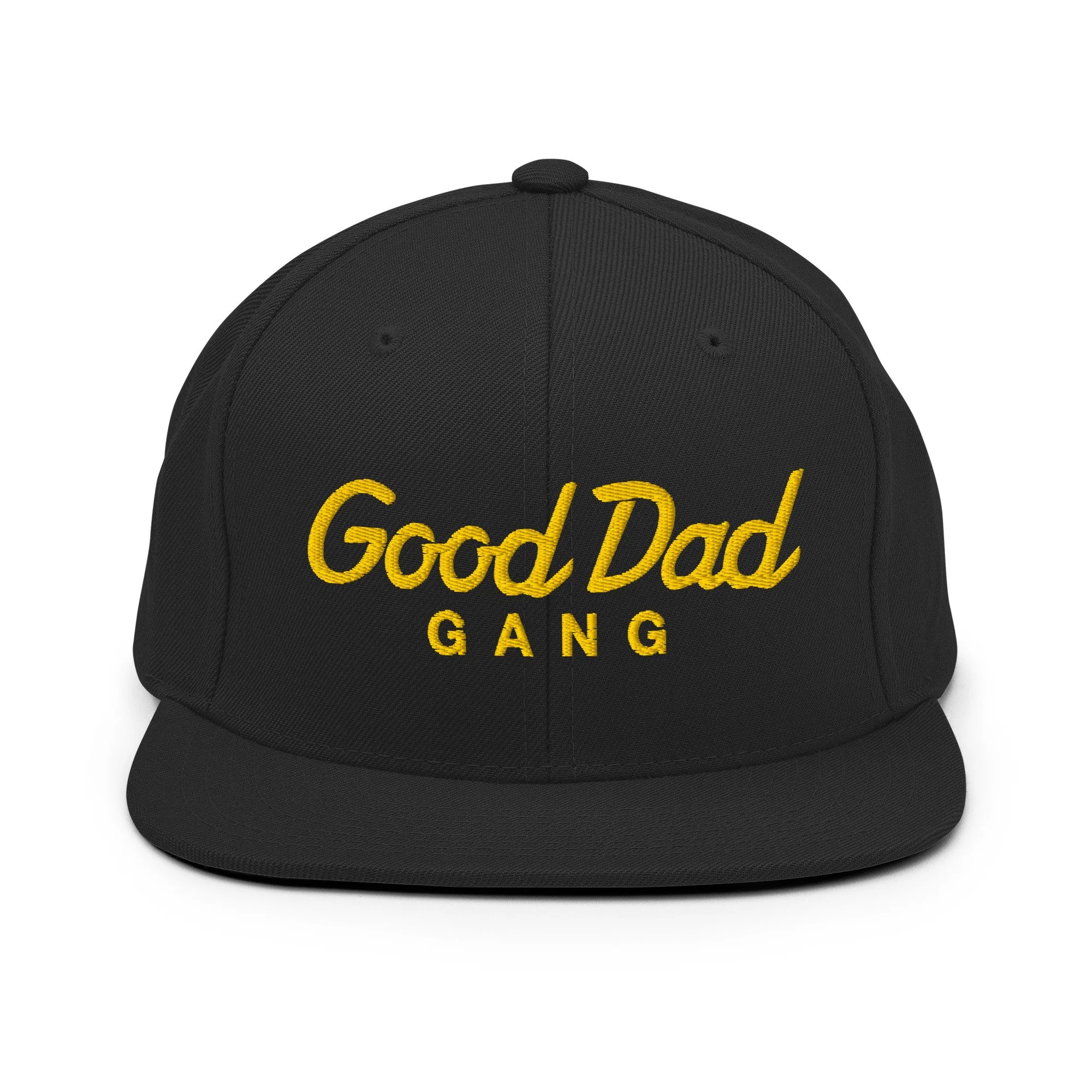 GOOD DAD GANG™ › Good Dad Gang Gold Script Logo Snapback Hat Image 1 of 6 Image 2 of 6 Image 3 of 6 Image 4 of 6 Image 5 of 6 Image 6 of 6 Good Dad Gang Gold Script Logo Snapback Hat $35.00 This hat is structured with a classic fit, flat brim, and full buckram. The adjustable snap closure makes it a comfortable, one-size-fits-most hat. • 80% acrylic, 20% wool • Green Camo is 60% cotton, 40% polyester • Structured, 6-panel, high-profile • 6 embroidered eyelets • Plastic snap closure • Green undervisor • Head circumference: 21⅝″–23⅝″ (54.9 cm–60 cm) • Blank product sourced from Vietnam or Bangladesh Add To Cart Added! This hat is structured with a classic fit, flat brim, and full buckram. The adjustable snap closure makes it a comfortable, one-size-fits-most hat. • 80% acrylic, 20% wool • Green Camo is 60% cotton, 40% polyester • Structured, 6-panel, high-profile • 6 embroidered eyelets • Plastic snap closure • Green undervisor • Head circumference: 21⅝″–23⅝″ (54.9 cm–60 cm) • Blank product sourced from Vietnam or Bangladesh